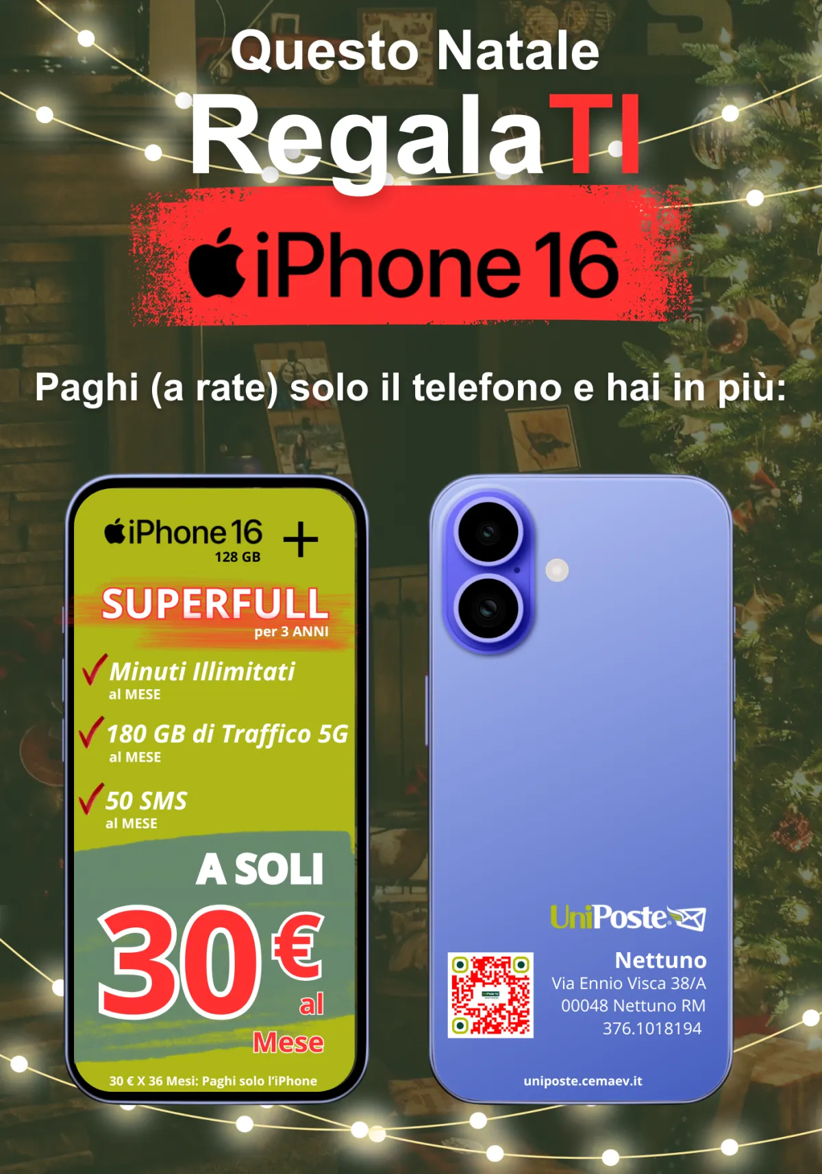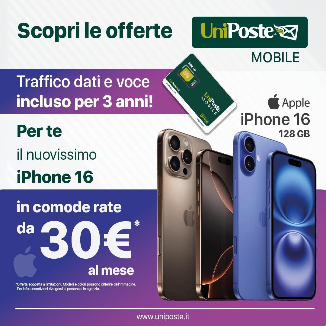 Con UniPoste Mobile hai il nuovo iPhone 16 a soli 30€ al mese, e nel prezzo hai già inclusi 3 anni di traffico voce e dati!